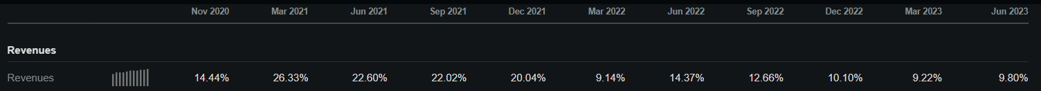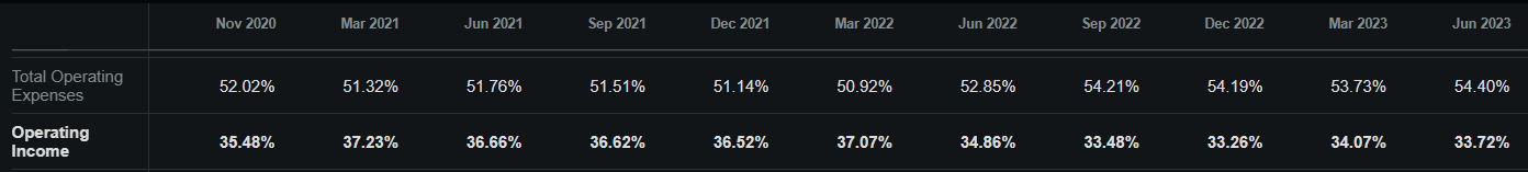 Revenues have grown consistently y/y, albeit now entering the high single-digits as of the last two quarters. For a company doing close to $5B a quarter in top line I still consider that to be the healthy. It also doesn’t seem that these figures are set to decline any further, with the latest quarter’s y/y revenue growth already a bit higher than the low point of Q1 ’23.