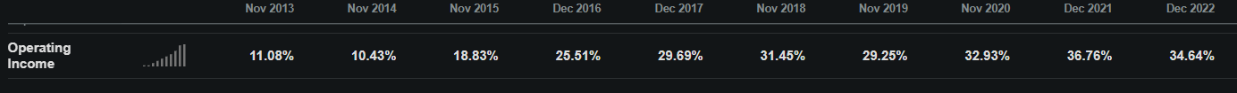 Current margins are nonetheless quite good relative to historical norms; over the last decade, this figure has fluctuated significantly for Adobe. Given the changing economics of software over this period I would expect the current levels to persist, namely 32% or higher operating margin for Adobe.