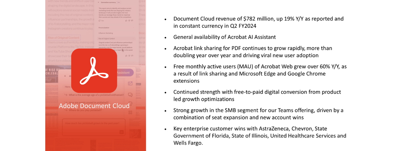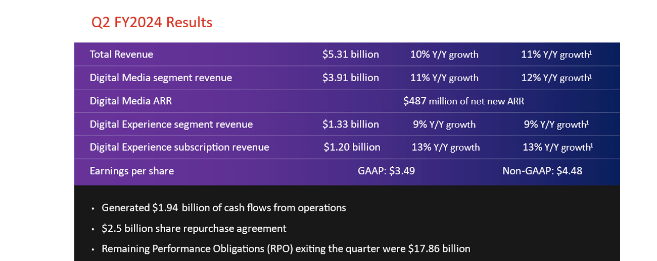 On the conference call, management noted that remaining performance obligations grew 17% YoY to $17.86 billion, with current RPO growing 12%. These are strong results which may imply that the company can sustain double-digit growth rates at least over the next year. Management credited their strength as being due in part to their successful rollout of generative AI products like Firefly. I (and likely many other investors) had previously been of the view that generative AI may help competitors by narrowing the competition. Instead, management cites Firefly as helping to both win new users as well as increasing retention rates. I am reminded of the business reality that there’s more to successful sales than just the functionality or product itself – just because the competition might be able to use generative AI to narrow their functional gap does not mean that they would have addressed the other factors like name brand, customer documentation, etc. After more than a year since the rise of generative AI, it is looking like a story told many times over: the strong just keep getting stronger. As one analyst succinctly put it on the call, Adobe embraced its prior pivot to the cloud to become a tech leader and appears to be doing it once again with generative AI.