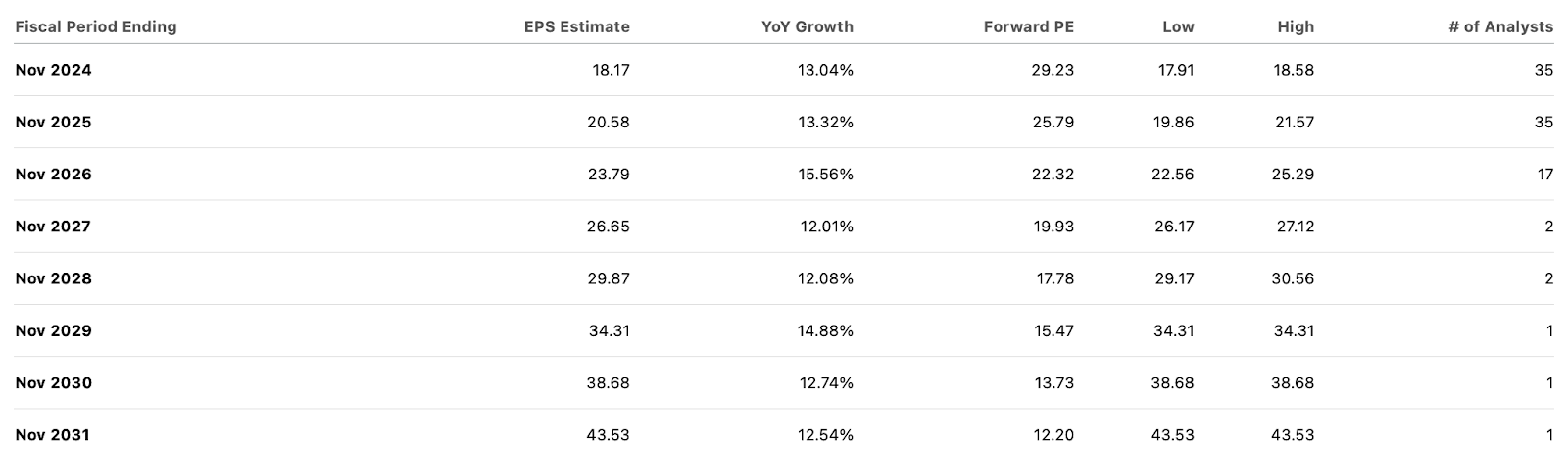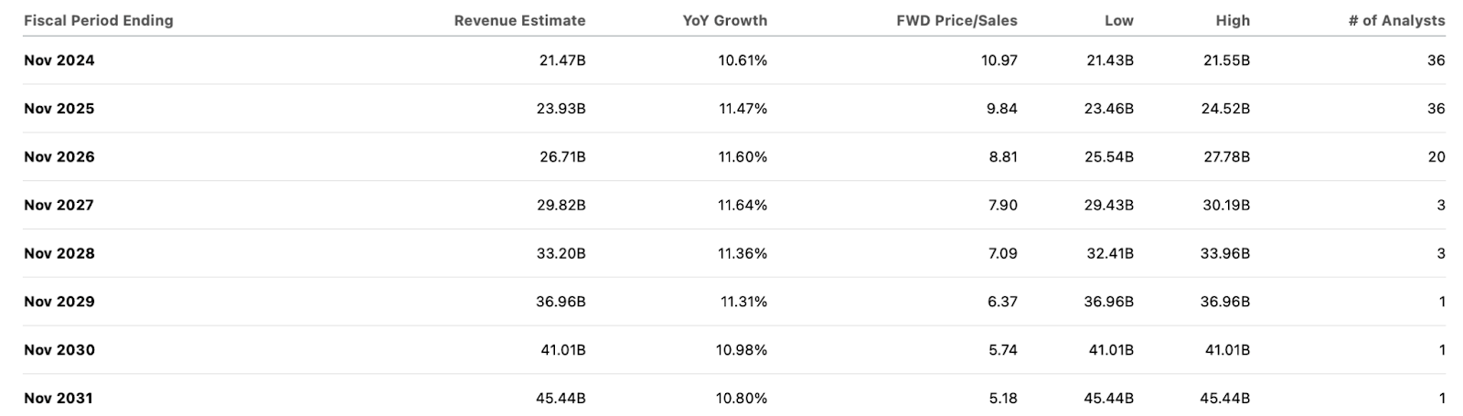 While the stock looks poised to deliver solid double-digit returns from here, it is admittedly difficult to make a case for substantial multiple expansion. That may mean that the stock may see some volatility in the event of a market downturn, especially if we see a repeat of the 2022 crash in tech stocks. While I am of the view that the just-mentioned tech crash had a sort of “educational” value to investors by showing the resilience of the revenue generation and operating leverage of the tech sector, it is possible that such a view might fade over time. It is also possible that my initial fear about disruption from generative AI may end up resurfacing in the future. I think the biggest near term risk is that consensus estimates look aggressive – I am doubtful that the company can sustain double-digit revenue growth indefinitely without consistent deceleration from the law of large numbers. I am of the view that the stock price is still justified even accounting for this anticipated deceleration, but it is possible that the stock still trades with volatility due to some initial disappointment.