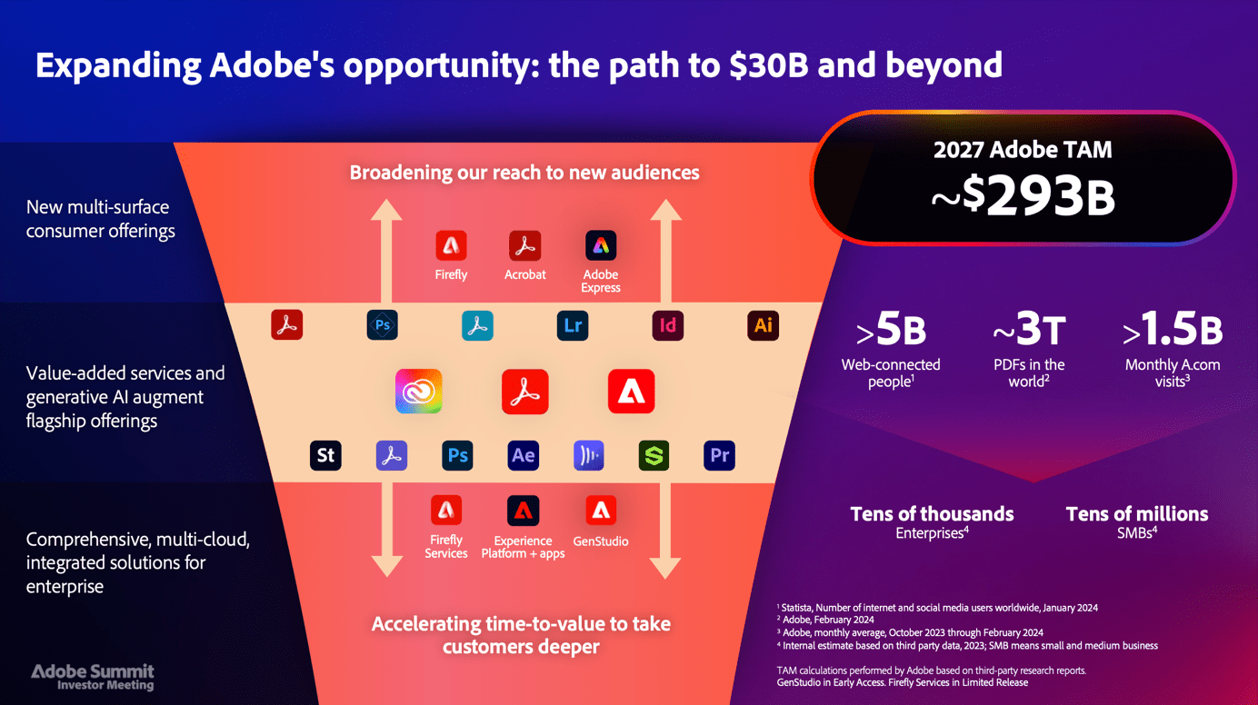 And we will come back to the fact that Adobe needs (high) growth to justify current valuation multiples. To achieve these growth rates, innovation and new products are necessary, and the company has to tap into new markets or take its share of the growing total addressable markets for its products.