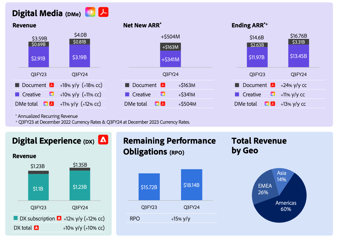- Adobe’s Q3/24 results show solid performance, with 10.6% YoY revenue growth and 23.3% YoY increase in diluted net income per share.