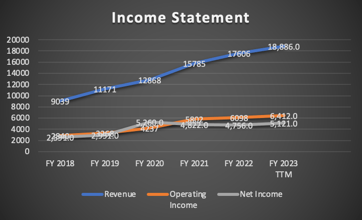 Concurrently, net income has exhibited growth at a rate of 19.52%. On a YoY basis, it has recorded the highest increase at 7.67%, surpassing both revenue and operating income.