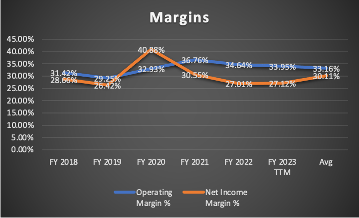 The stability of margins is noteworthy, with the current operating margin and net income margin standing at 33.16% and 30.11%, respectively. Looking back to 2018, these margins have consistently hovered around the 30% mark, except for a notable spike in net income margin to 40.88% in 2020, followed by a swift decline.
