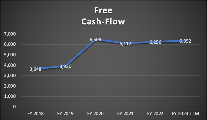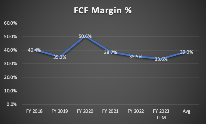 In terms of free cash flow, Adobe has consistently generated over $6B since 2020, translating to an impressive margin of 39% when compared to revenue.