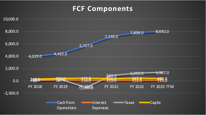 A closer look at the “free cash flow components” table reveals an upward trend in taxes. Since 2021, Adobe’s tax expenses have surged by approximately 27.2% annually.