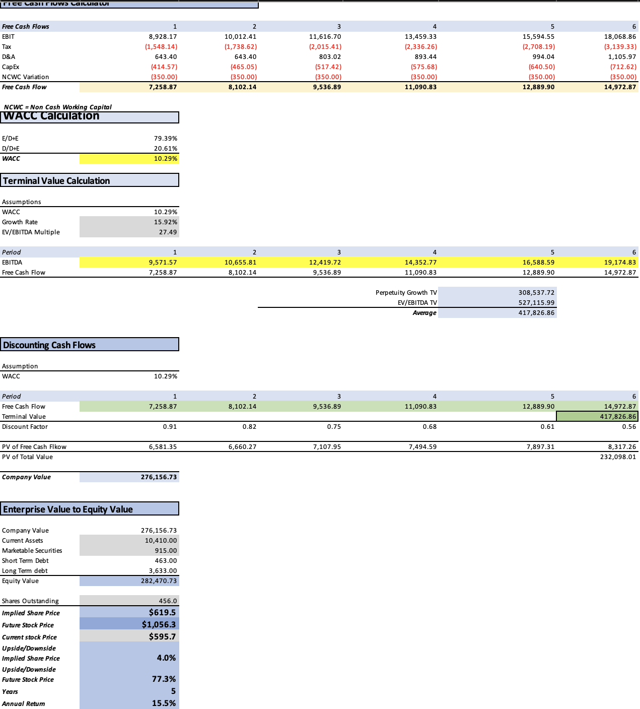The outcome of this initial model yields a fair price of $619.5. In relation to the current stock price of $595.7, this implies an upside of 4%. Moreover, it suggests a prospective stock price of $1056.3, indicating an annual return of 15.5% over the next 5 years.