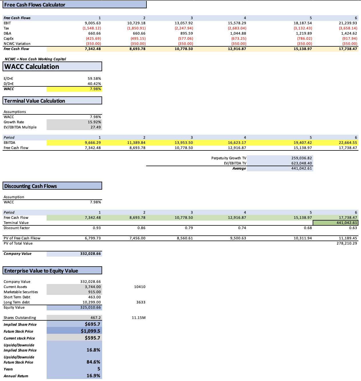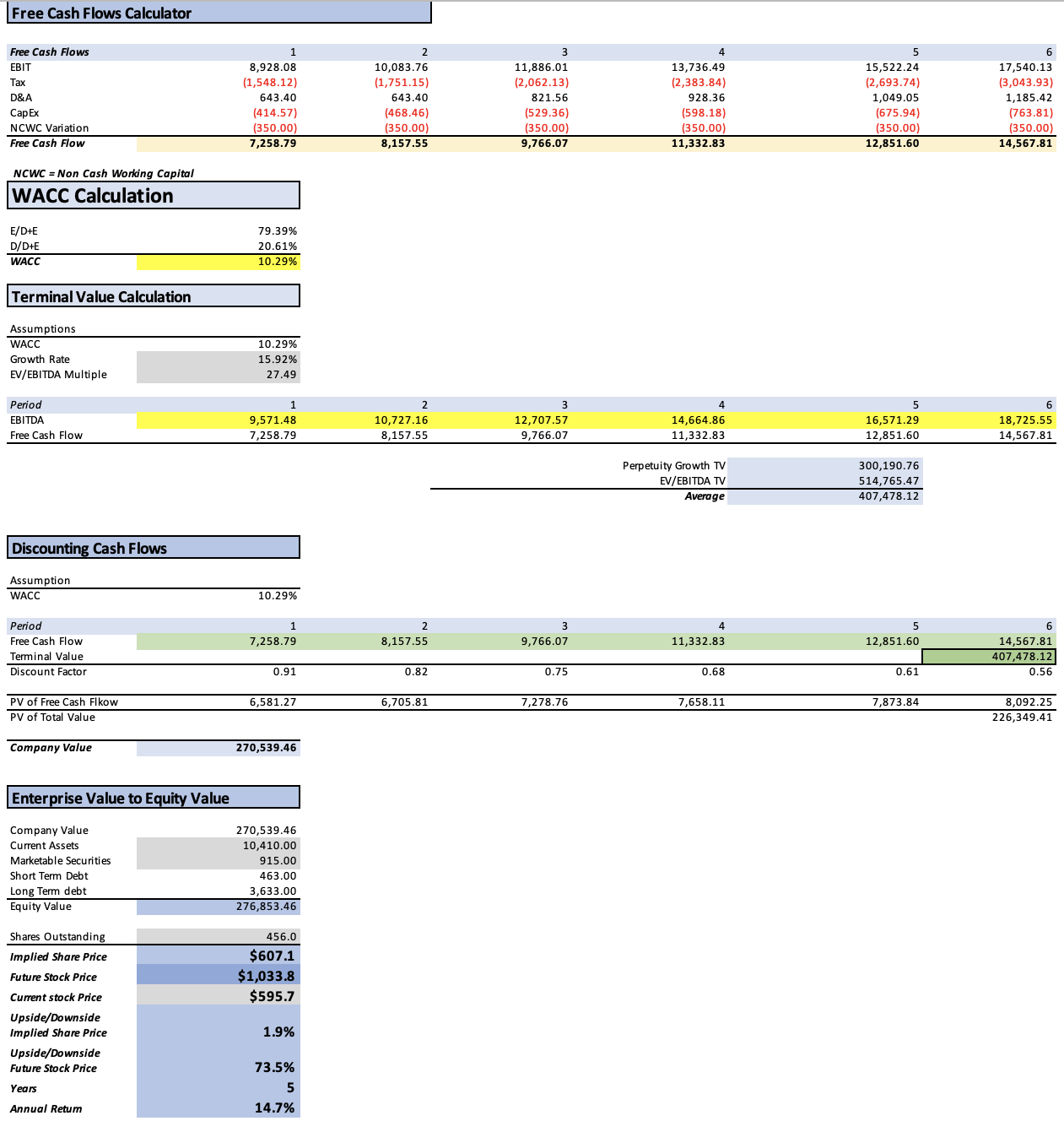 The outcome of this second model establishes a stock price target of $607.1, reflecting a 1.9% increase from the current stock price of $597.7. Additionally, it suggests a projected 2028 stock price of $1,033.80, indicating an upside of 75.5%. This equates to annual returns of 14.7%.