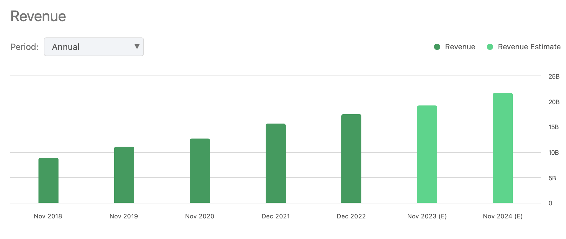 Since FY2018, Adobe’s revenue has experienced an annual growth rate of 21.91%. On a year-over-year (YoY) basis, the increase in revenue has been a more moderate 6.81%. Operating income has followed a similar trajectory, expanding at a rate of 25.15%, while on a YoY basis, it has grown at a rate of 5.14%.