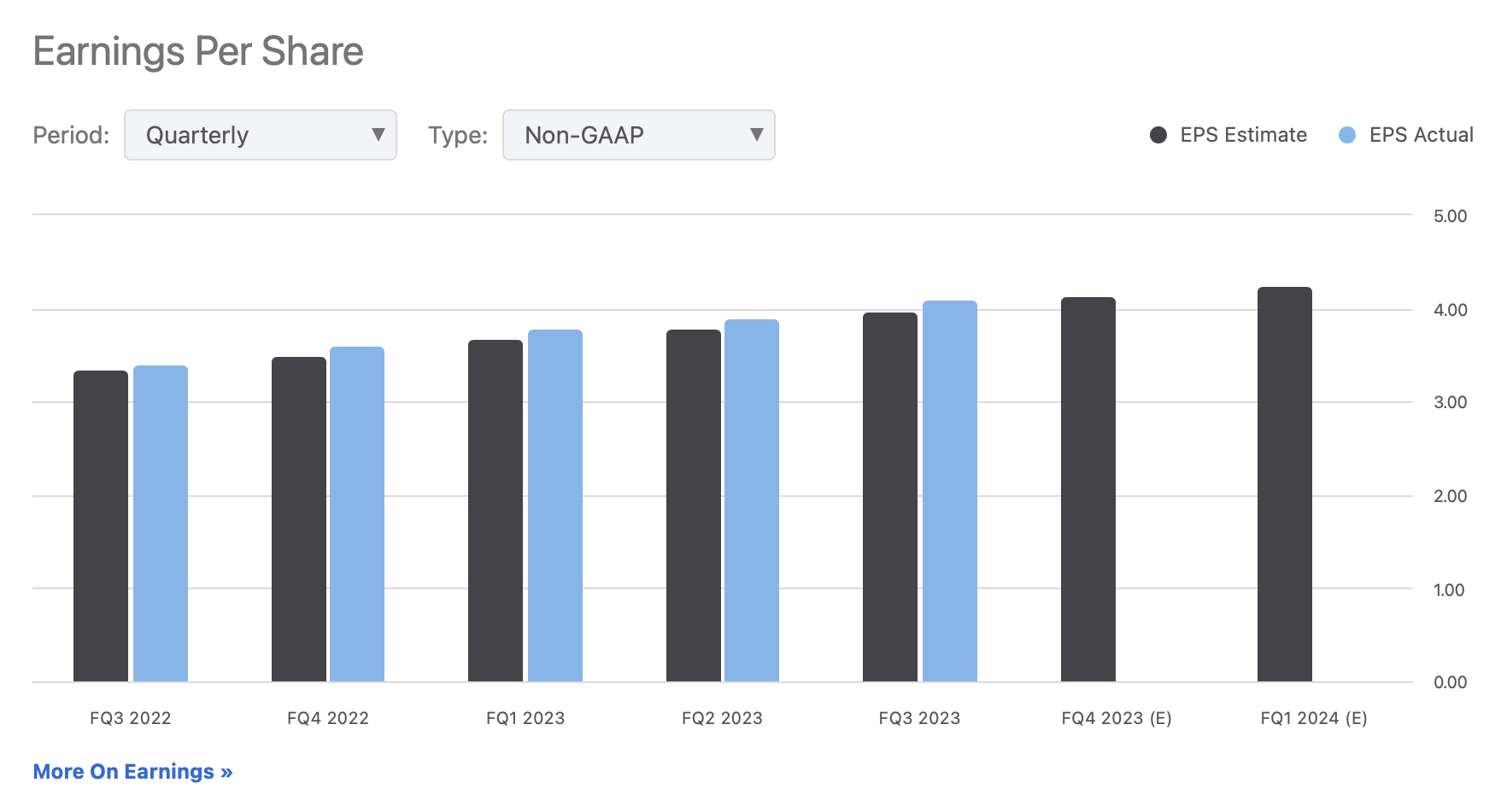 In terms of EPS, analysts anticipate $4.14 for FY2023 and $4.26 for FY2024, corresponding to net incomes of $7.2B and $8.25B, respectively.