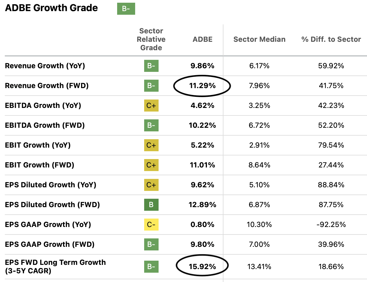 For the initial model, I will assess Adobe’s valuation based on current analysts’ estimates for revenue and EPS, as well as incorporate the anticipated forward revenue growth and the 3-5 year long-term EPS growth.