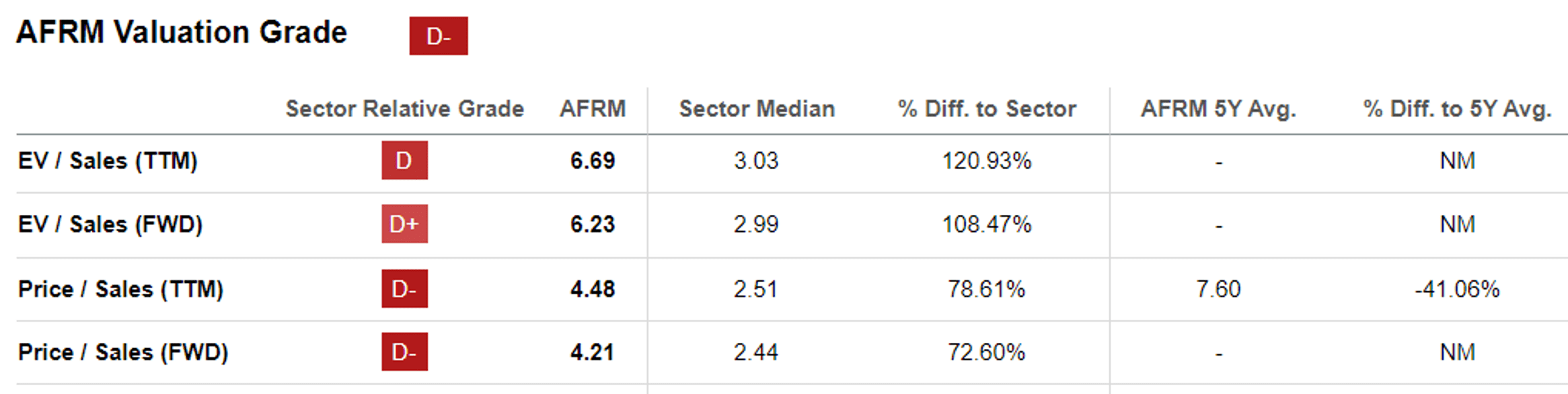 This is especially since the consensus forward estimates that AFRM may chart an excellent top-line growth at a CAGR of +26.9% through FY2026 (up from previous estimates of +20.3%), compared to SQ at +11.6%, PYPL at +8%, SOFI at +18%, UPST at +16.7%, MA at +12%, and V at +10.2%, implying that the former is reasonably valued for its accelerated growth prospects.