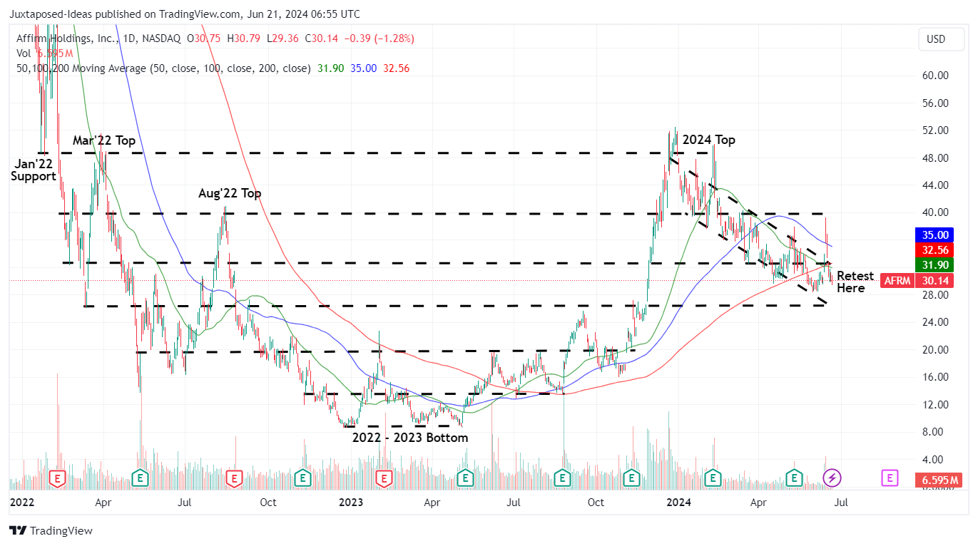 For now, AFRM continues to chart lower lows and lower highs since the 2024 top, with it currently retesting the next support ranges of $28s and $32s.