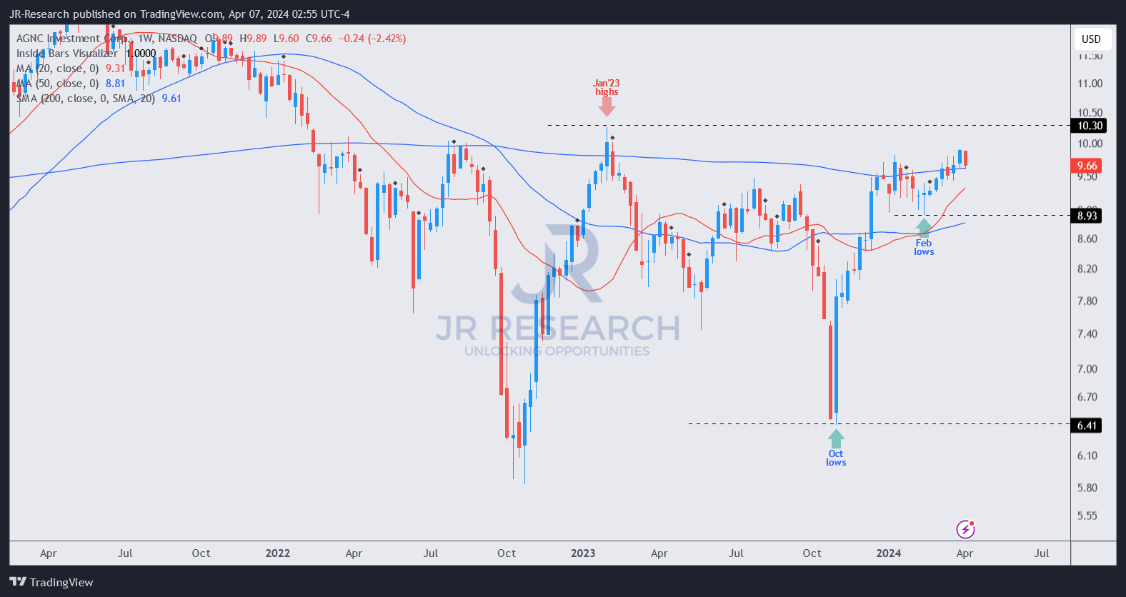 AGNC has shaken off its downward bias since its recent bottom in February 2024 at the $9.2 level. When adjusted for dividends, it’s clear that dividend investors have appreciated AGNC’s relatively undervalued appeal, as they returned to defend against further downside volatility in February.