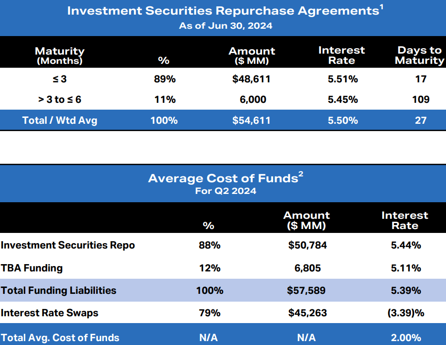 AGNC reported its weighted average coupon at 4.95%. However, with interest rates high, the rate that AGNC has been paying on its repos has been 5.5%. They have been paying more to borrow than they receive from their assets – which has been a headwind to cash flow. However, that isn’t the whole story, AGNC has $45 billion in interest rate swaps which reduced their effective cost of funds to just 2.00%.