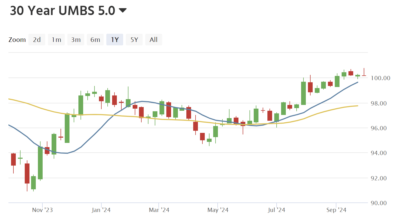 Throughout 2024, we saw MBS prices dip and rally a few times as the market’s predictions of when the Fed would cut were dashed. Source
