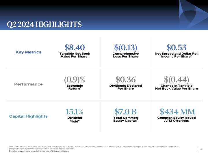 “Lastly, in the second quarter, we issued $434 million of common equity through our aftermarket offering program. Our capital management framework provides us the ability to opportunistically create incremental value for existing stockholders through book value and earnings accretion. In the second quarter, we issued stock at a substantial price-to-book premium and invested those proceeds in attractively priced assets.”