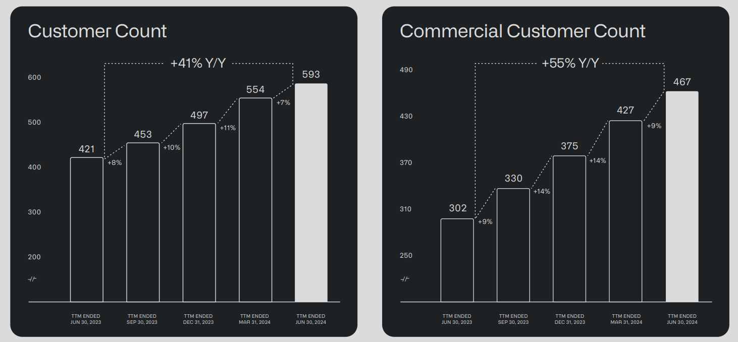 A larger number of customers are also flocking to Palantir’s platform, which implies improving prospects for organic revenue potential in the quarters ahead. Palantir continued to see considerable customer acquisition momentum across its segments, but especially in Commercial in Q2’24. In the second fiscal quarter, the software company added 40 customers in its commercial business. Year-over-year, Palantir’s customer count surged by 55% with AIP being a magnet for customer acquisition.