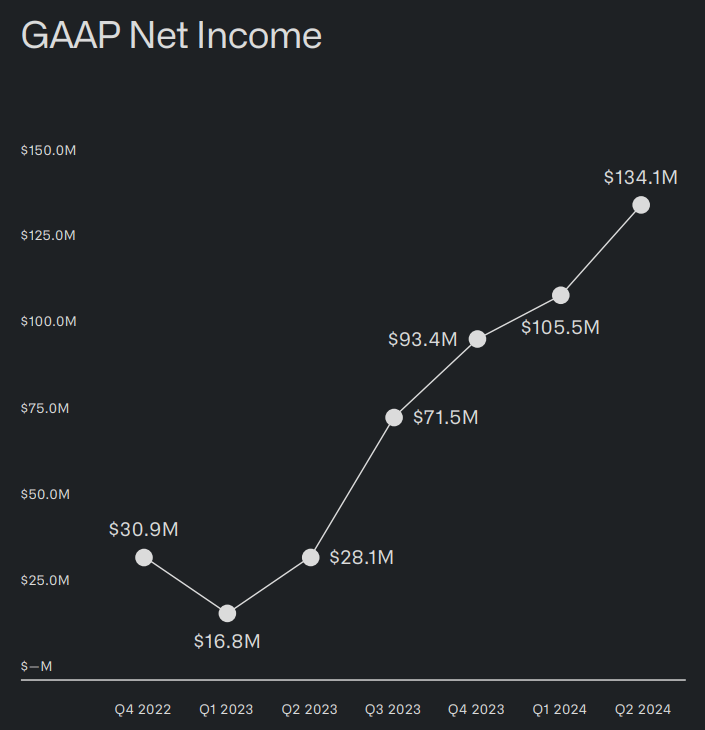 Palantir generated its highest profit in the firm’s history in Q2’24 on growing uptake of the company’s AI platform. The analytics company reported $134.1M in net profits in the last quarter, showing a year-over-year growth rate of 377%. This growth came mainly from the U.S. commercial segment, which grew about twice as fast (+55% Y/Y) as Palantir’s consolidated top line (+27% Y/Y).