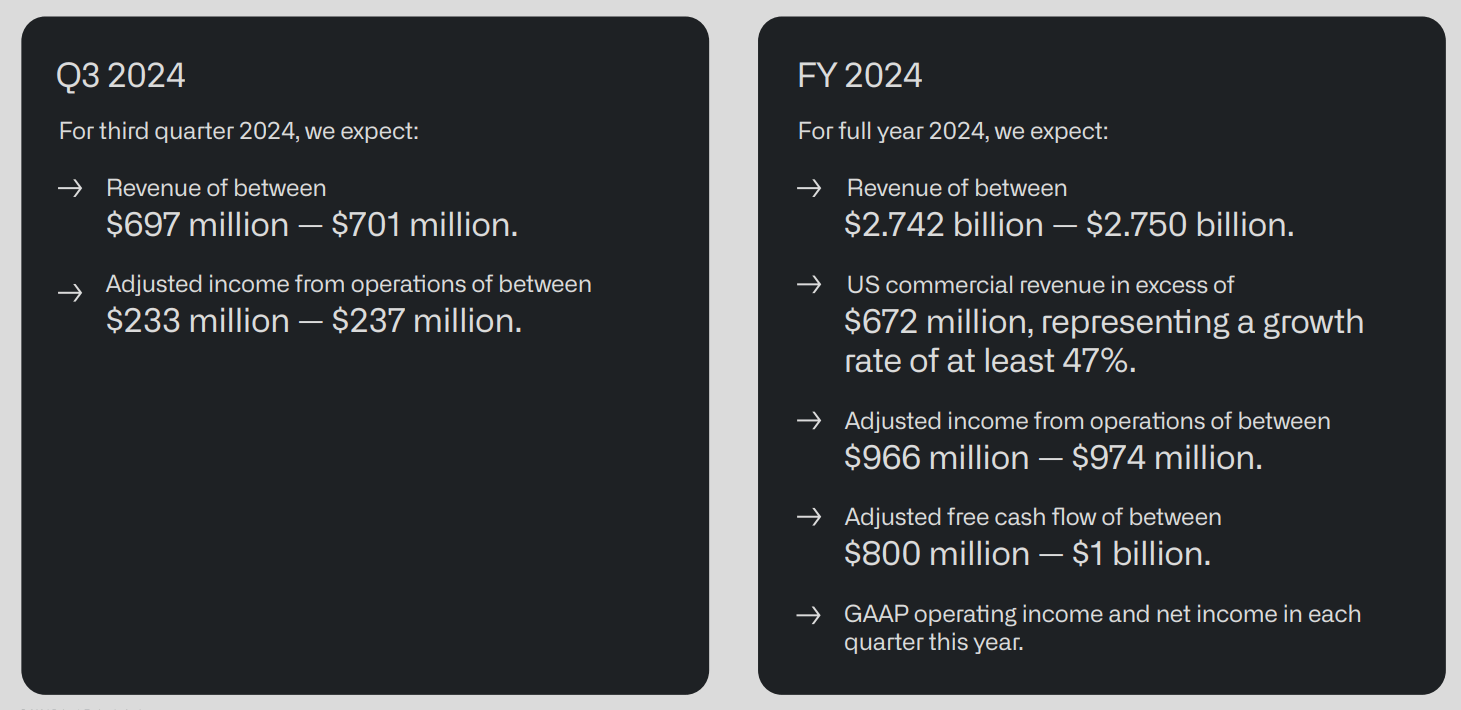 With the company adding a good amount of new customers and enterprise clients being willing to spend on AI capabilities, Palantir had the confidence to raise its revenue outlook a second time this year. Palantir now expects to generate $2.742-2.750B in revenue in FY 2024, increasing its guidance by $63M at the mid-point. The new guidance implies a 23% year-over-year growth rate, as opposed to 21% Y/Y that was guided for in the last quarter.