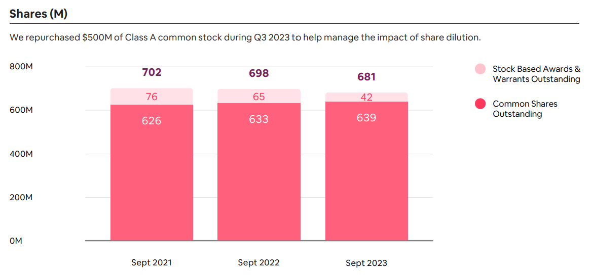 Like many tech companies with a very strong growth path, Airbnb pays many employees not only in cash but also in stock. This creates shareholder dilution, which obviously I don’t like. As we can see below, Airbnb’s share count has decreased only a tiny bit since 2021.