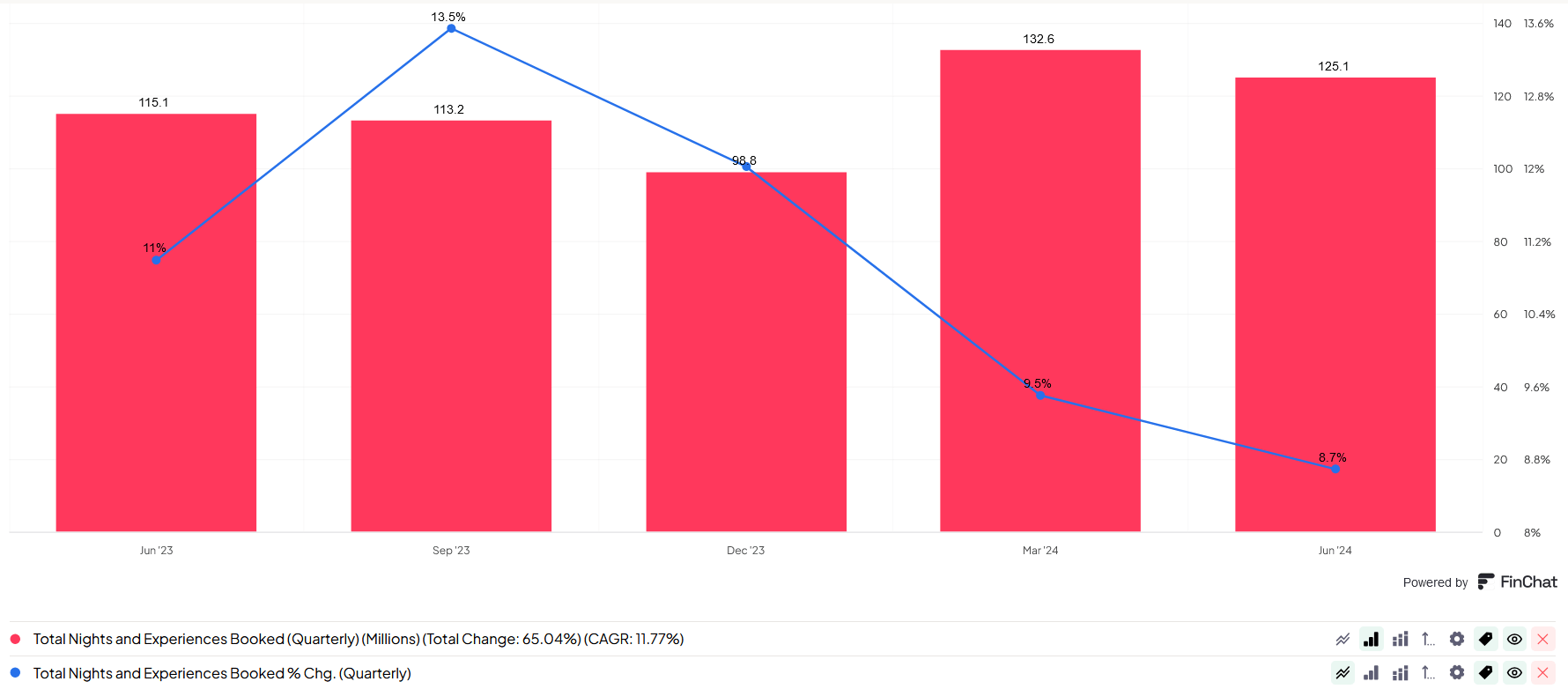 During the quarter, Airbnb had 125.1 million nights and experiences booked which as you can see from the graphic below has steadily increased, up 9%, compared to the prior year, although as the blue line illustrates growth rates are declining: