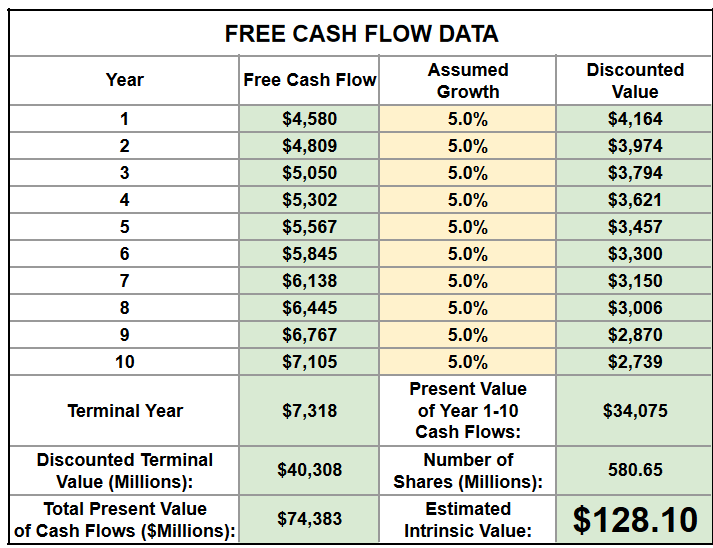 Also, using a reverse discounted cash flow model with a discounted rate of 10% and a terminal rate of 3% and assumed growth of only 5%, I come to an estimated intrinsic value near the current share price: