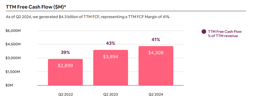 Our total trailing 12-month free cash flow was $4.3 billion, our highest ever. This strong cash flow allowed us to repurchase $749 million of our shares in the quarter. As of the end of Q2, we had $5.25 billion remaining on our share repurchase authorization program.
