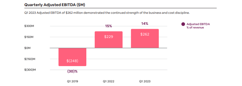 ABNB sustained a respectable 14% adjusted EBITDA margin – for context investors must remember that the first quarter of the year tends to be slower for travel demand.