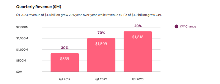In its most recent quarter, ABNB saw revenue growth decelerate meaningfully to 20% YOY. Unlike in the past few years where the company benefited from rapidly rising average daily rate (‘ADR’) growth, ADR remained stable with the bulk of growth coming from growth in rooms sold.