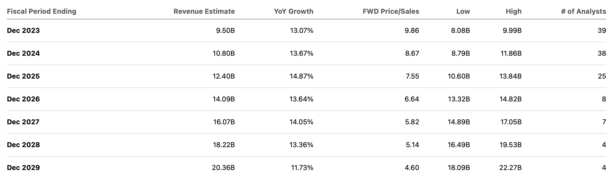 I assume that the company can sustain 30% net margins over the long term. Based on 14% revenue growth and a 1.5x price to earnings growth ratio (‘PEG ratio’), I could see the stock trading at around 6.3x sales, implying that the stock may be dead money over the coming years.