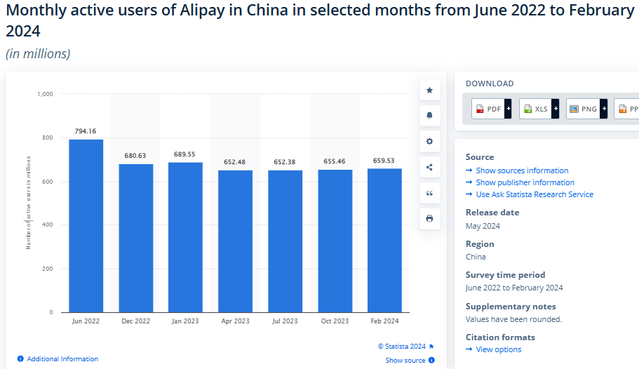 As such, Alipay is an opened door to other services, which implied the management of the data of its 711 million active monthly users (AMU) in 2020; nevertheless, according to the chart above, that number was actually declining, reaching only 652 million in April 2023. It seems that the AMU has already stabilized, as we can see that that number increased to 659 million in February 2024, which is positive news.