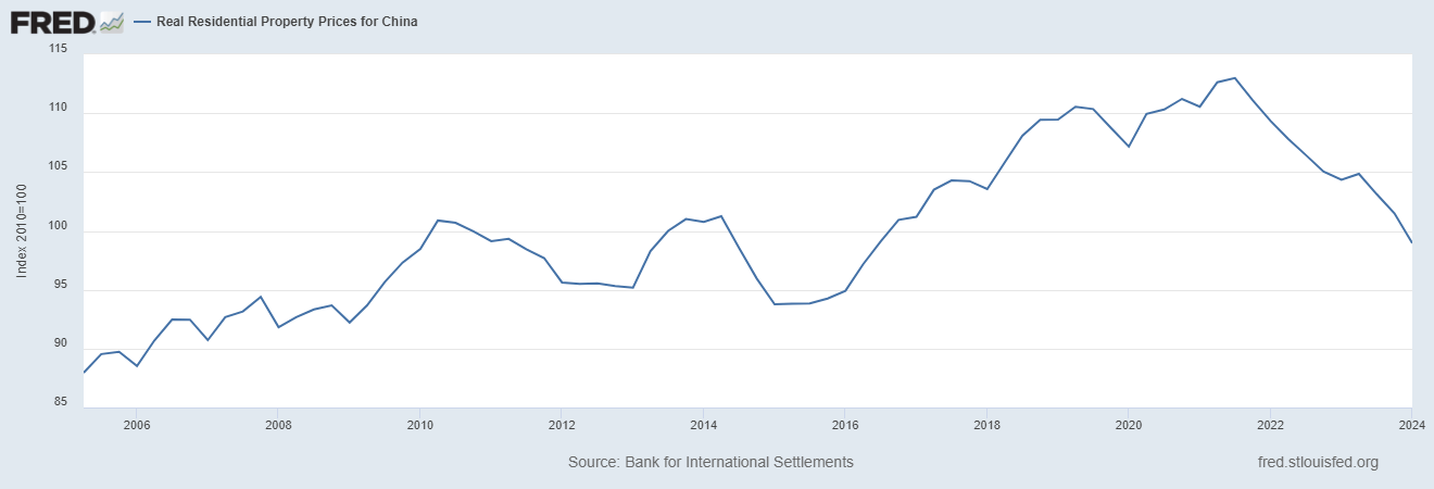 Taking a look at the Real Residential Property Prices for China, a sharp slump from 2022 is evident, and the bottom has not yet been reached. This is not the only index showing a sharp decline in the real estate market, there are many others.