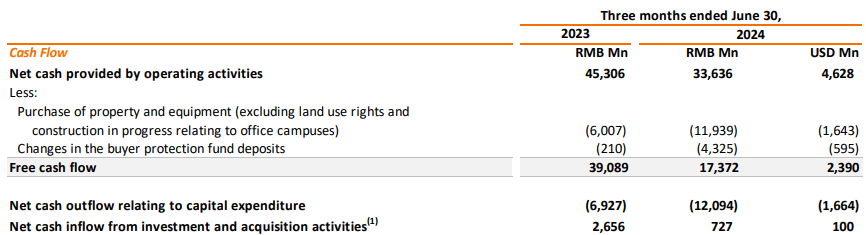 Free cash flow decreased by RMB21.7 billion to RMB17.4 billion. This year-over-year decrease mainly reflected the increase in expenditure related to our investments in Alibaba cloud infrastructure and other working capital changes related to factors, including our planned reduction of direct sales businesses.