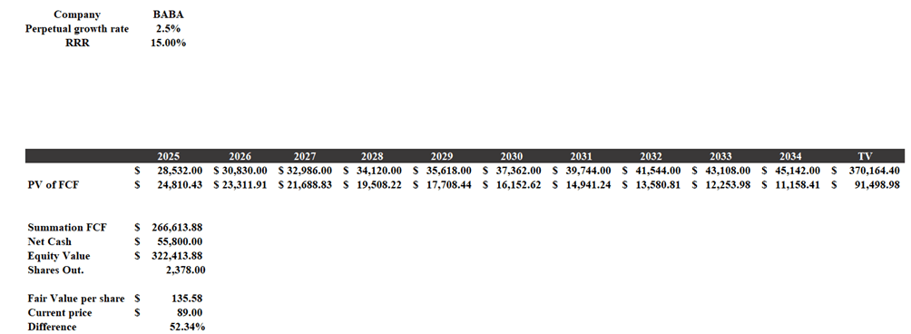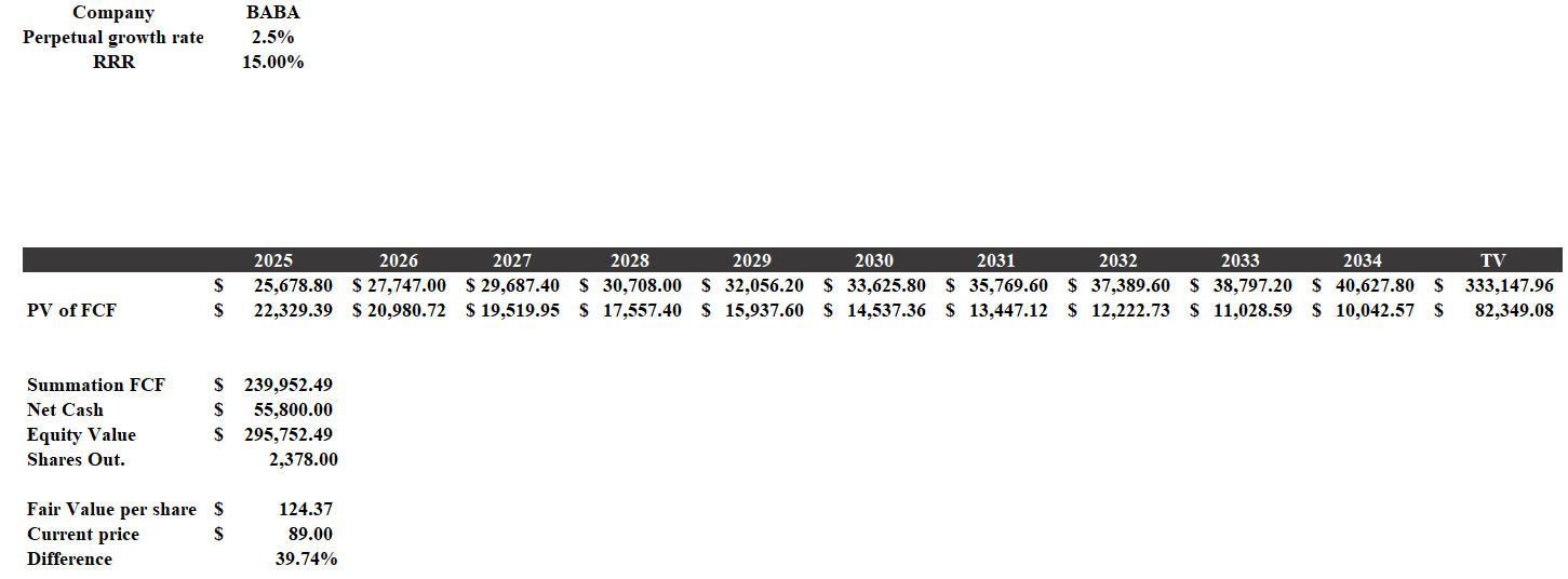 Thus, although the RRR is huge, Alibaba is undervalued by almost 40%. In other words, at the current price there is the potential for an investment that could generate a return of more than 15% per year, beating the average historical return of the S&P500.