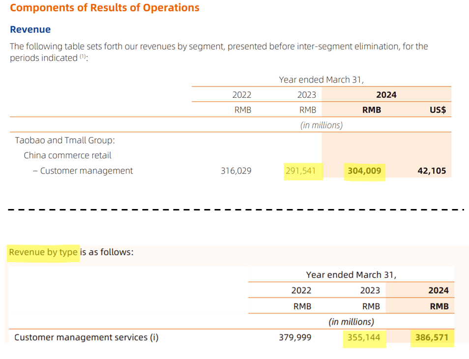 Alibaba’s international commerce retail business outside of China is booming, with sales up 38% year-over-year in the last quarter. Management’s strategy here is twofold: enhancing operational efficiency while actively investing in key markets to drive scale. Losses have widened year-over-year due to intensive reinvestments, but we think Eddie Wu would not plow back money into this venture unless he was convinced that it is going to yield handsome returns. All businesses here, such as Lazada or AliExpress, are third-party platforms at heart, so there is a real chance they will deliver new high-margin revenue streams outside of China. In fact, after diving deeper into Alibaba’s annual report, we can already see (figure below) a pretty sizable gap between the reported CMR revenues of the domestic Taobao and Tmall Group and the total annual CMR-like revenue streams reported under the “revenue by type” section. This difference likely stems from marketing fees generated by the international segment.