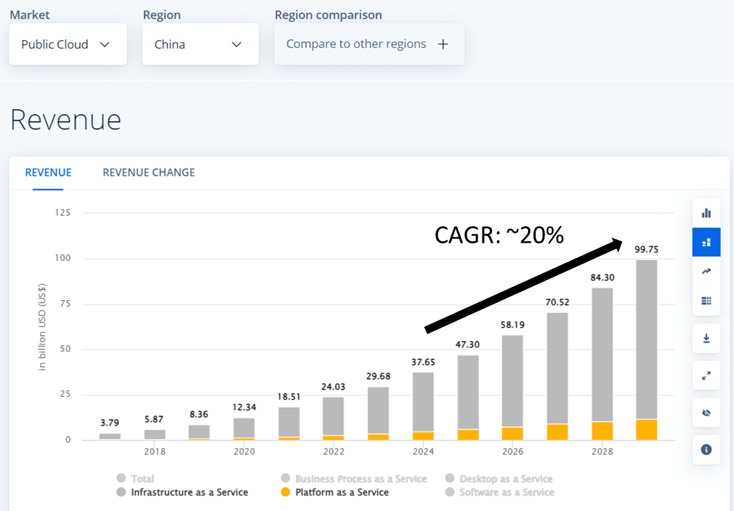 Alibaba’s end markets continue to ride on a plethora of tailwinds. The three most important are: rising domestic consumption, widespread adoption of the cloud, and the impact of globalization. Despite cautious spending caused by the bursting of the real estate bubble, China is gradually transitioning to a consumer society with a rising middle class and growing disposable income. As Tencent’s CEO noted on the most recent earnings call, a pickup in domestic spending is „not a matter of whether, but a matter of when.” The headroom for growth is enormous here: in 2023, China’s per capita GDP was still only about one-sixth that of the U.S., and it is forecasted to grow by ~5% annually over the coming decade. The second pillar of growth is the swiftly expanding cloud computing market, which is expected to grow at a rate of 15-18% globally over the next decade, with the Asia-Pacific anticipated to emerge as the fastest-growing region.