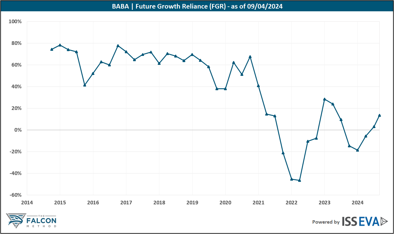 It is important to note that Alibaba’s current profitability figures continue to be dampened by paper losses from its equity investments. Cleaned from these one-off items (but not assuming normalized profitability levels, reflecting the medium-term impact of heavy capital outlays), the FGR would stand at -20% as of today. It is incredibly rare when an EVA Monster trades with less than zero priced-in growth. Since we have every reason to believe that Alibaba will produce greater amounts of EVA in the coming decades, this stock appears unreasonably cheap from a fundamental perspective, whether you look at it from a market-relative or historical valuation standpoint.