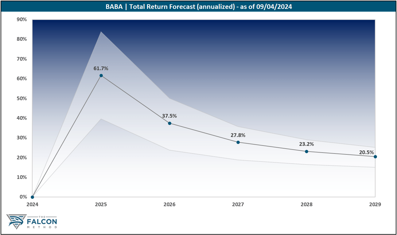 Here’s what the annualized total return outlook looks like for Alibaba from today’s levels, based on the inputs outlined above: