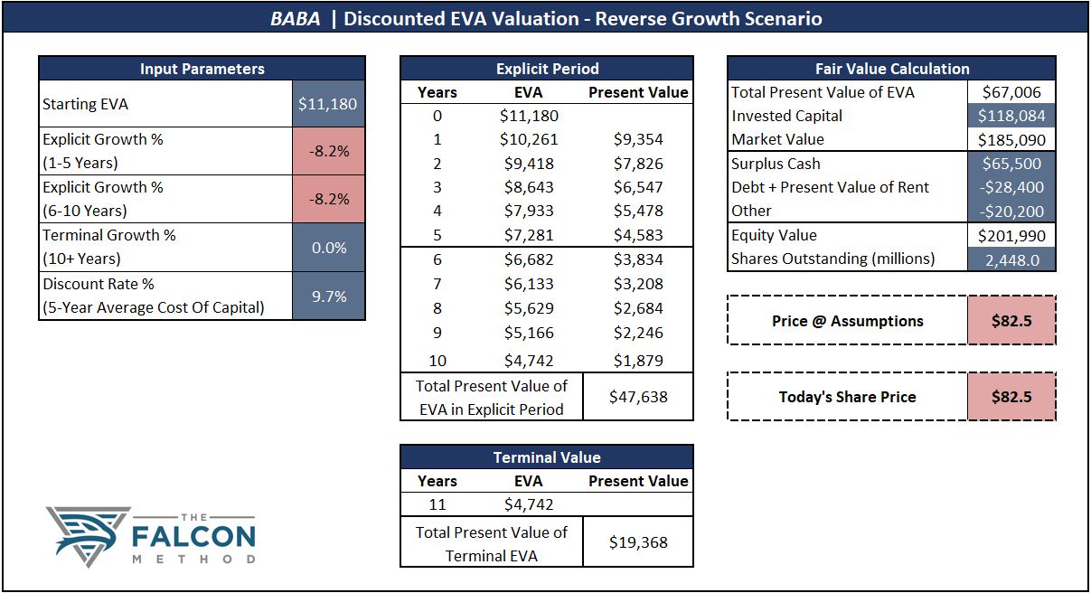 Turning our valuation framework upside-down, we also like to compute the market’s expectations baked into the share price, expressed as the annualized EVA growth rate that would justify the stock’s current valuation. Considering a 9% EVA Margin as a normalized baseline today, the current stock price implies an ~8% annual contraction in Alibaba’s EVA. In other words, the market believes that nearly two-thirds of the company’s current economic profits will evaporate in a decade. The baked-in EVA Margin in 10 years sits at roughly 2%, which is far from the double-digit figure we expect to see. In a nutshell, our reverse discounted EVA valuation model also confirms that investors’ expectations regarding Alibaba are ridiculously low. At the current market cap, excluding roughly $65 billion of excess cash, you can buy the core Chinese e-commerce cash cow at a free cash flow multiple of 5, plus you get everything else (the cloud, the international business) for free.