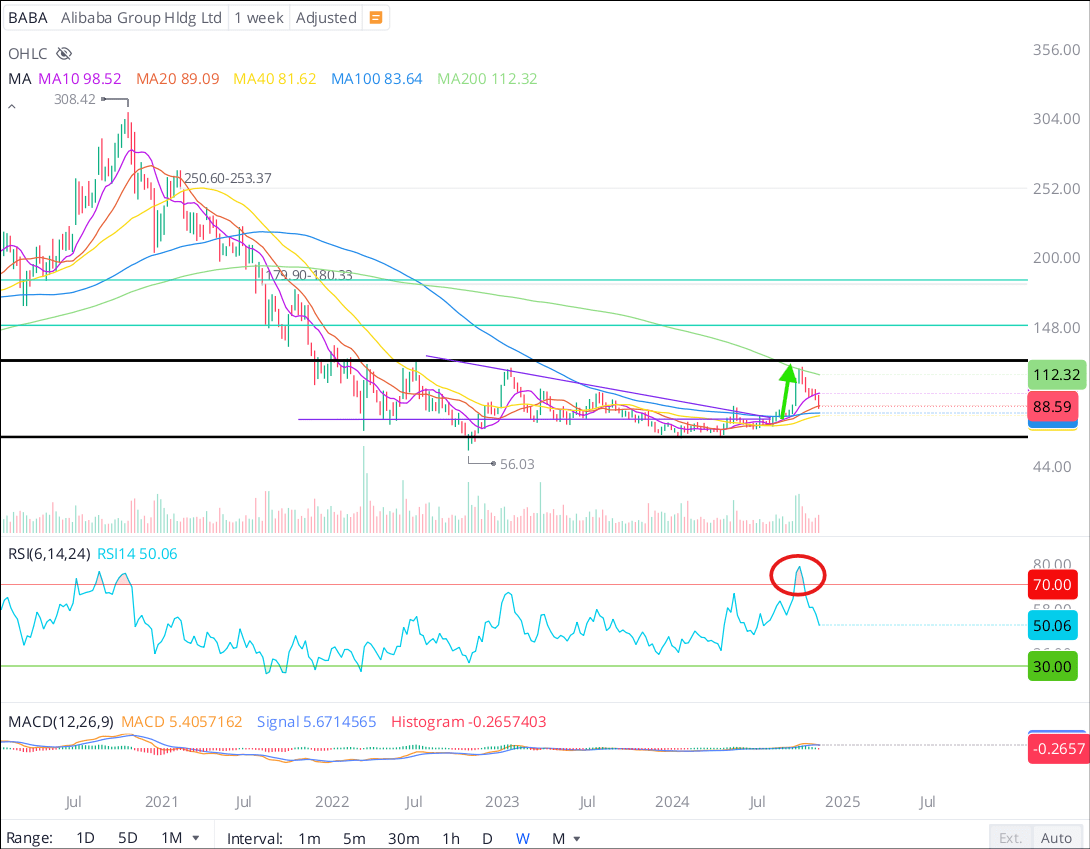 Now, with China unveiling a flurry of monetary and fiscal stimulus, Chinese equities came to life in late September. For its part, Alibaba soared to the upper end of its Stage-I accumulation base at $120 in a vertical run-up: