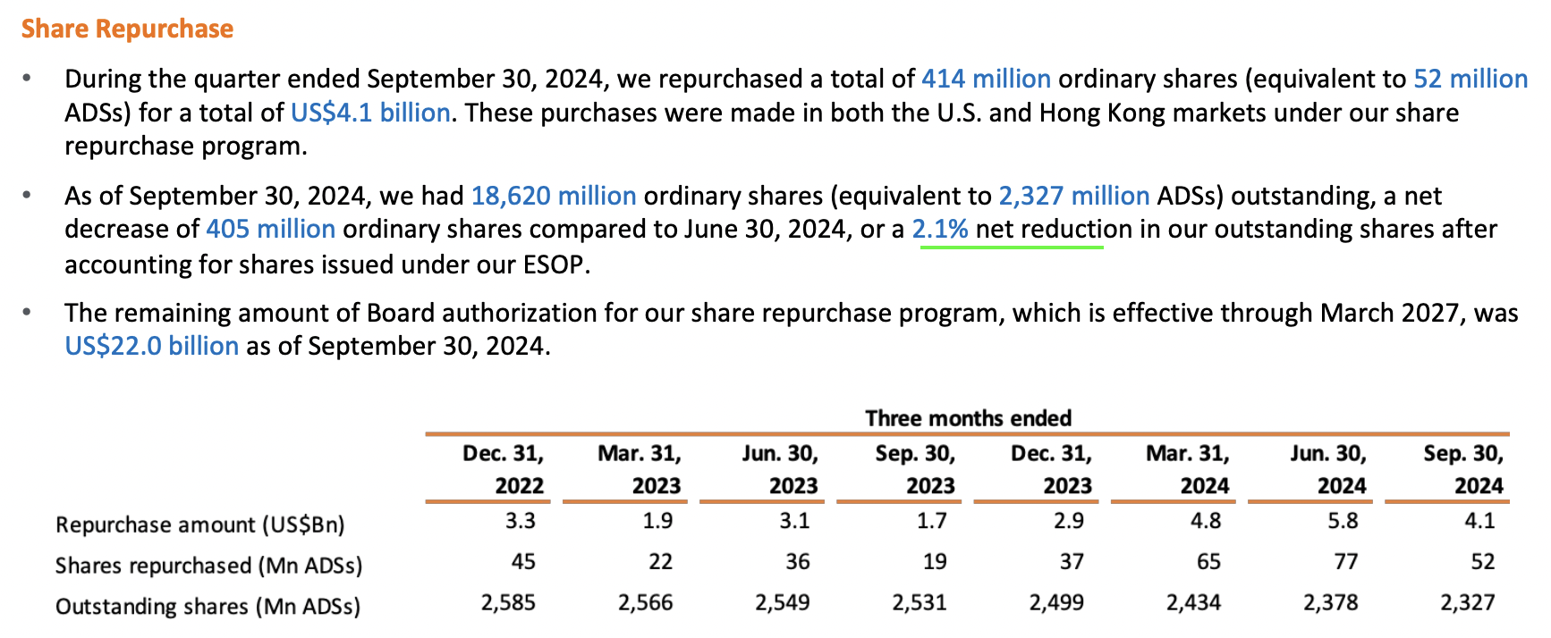 In Q2 FY2025, Alibaba returned $4.1B to shareholders via stock buybacks — reducing outstanding share count by -2.1% from June 2024: