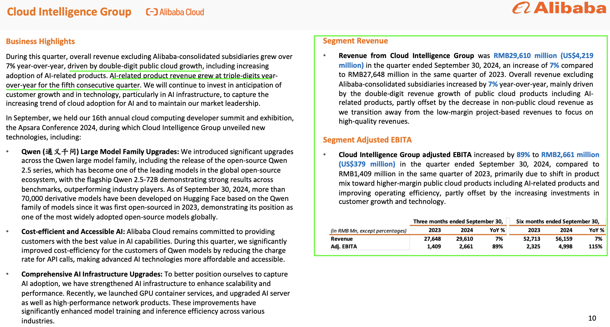 In Q2 FY2025, Alibaba saw revenue growth of 5% y/y, driven by improved monetization in Taobao & Tmall, and triple-digit AI-related product revenue growth in Alibaba Cloud.