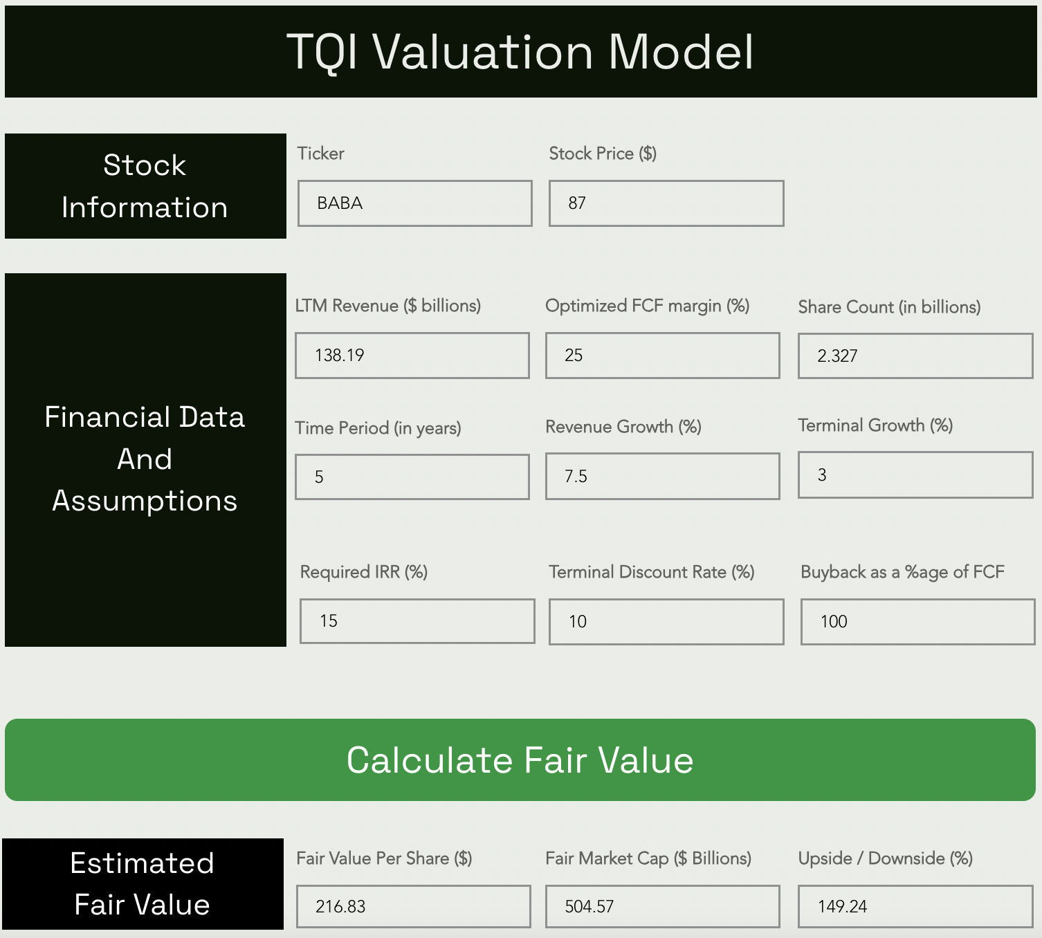 Based on reasonable assumptions for future sales growth and optimized FCF margins, TQI’s fair value estimate for BABA stock has increased from ~$200 per share to ~$217 per share. Given Alibaba is trading in the high ~$80s, I see a +150% upside to fair value for BABA stock.