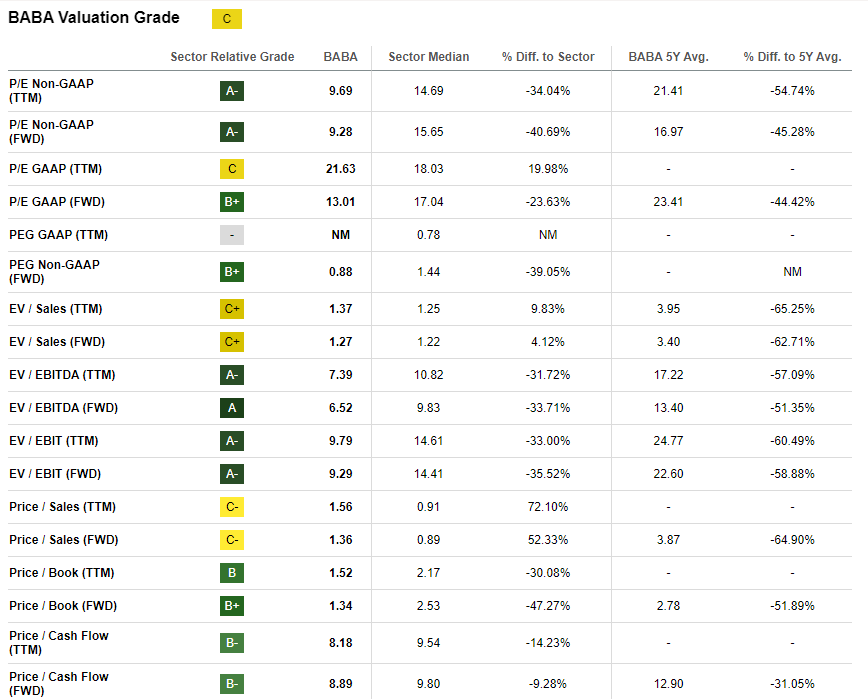 Most of Alibaba’s valuation ratios are significantly lower than the sector median, and all of the current multiples are substantially below BABA’s historical averages. That said, valuation ratios point to substantial undervaluation.