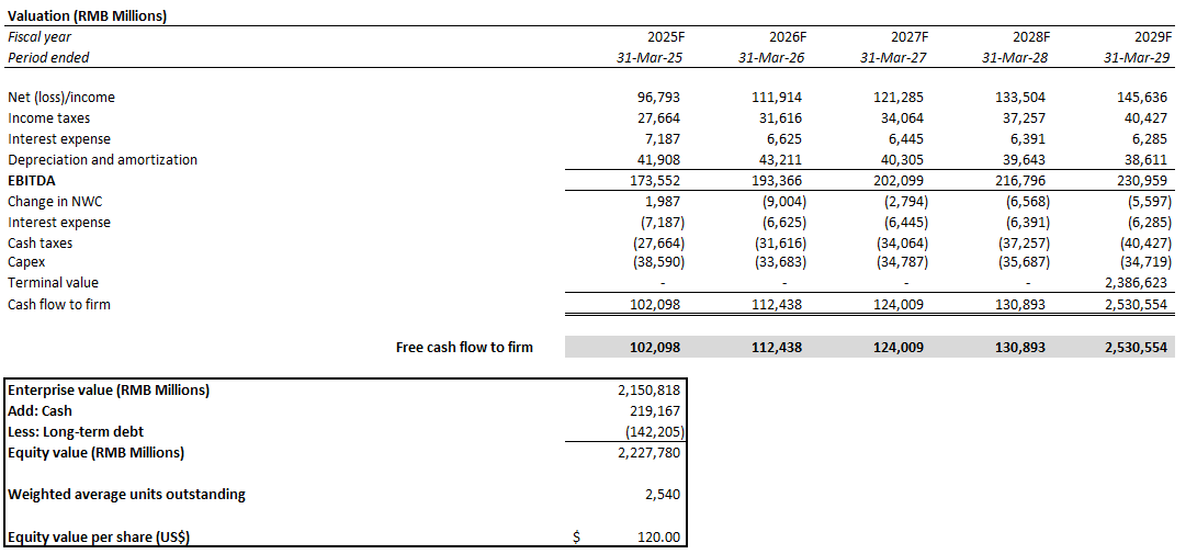 The upside scenario price is derived under the DCF approach. This approach offers a fair presentation of the company’s estimated intrinsic value, in our opinion, without dilution from peer multiples that continue to face elevated exposure to China risks. The analysis considers cash flow projections reflective of a stronger growth profile underpinned by incremental global opportunities, particularly through Alibaba’s AI capabilities. The key valuation assumptions (i.e., 9.7% WACC; 3.5% perpetual growth rate) remain unchanged from the base case.
