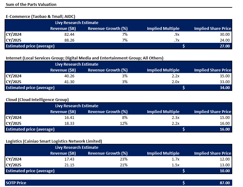 Under the SOTP approach, Alibaba yields an estimated intrinsic value of $87 apiece. The analysis considers peer multiples on a relative basis to growth observed across the Internet, e-commerce, cloud, and logistics sectors.