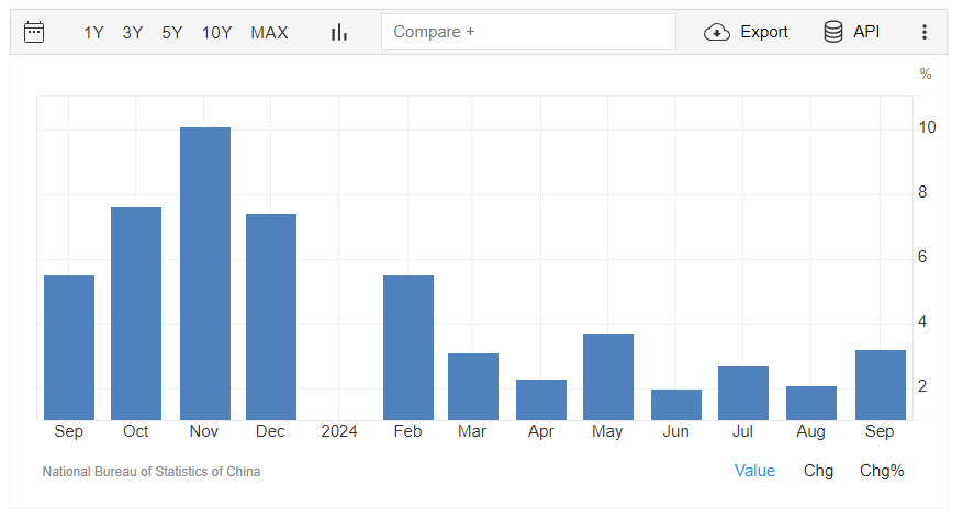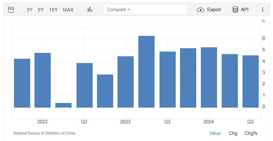 China’s economy has seen a very slow, sluggish and choppy recovery after the COVID pandemic. China’s GDP rose 4.6% in the third quarter, which was weak in China’s historical context, but it beat the estimate of 4.5% growth regardless. It was also the lowest annualized growth figure since 1Q23, which suggests that China’s economy is not doing all that well. The Communist Party of China is targeting 5% per annum growth in its gross domestic product this year, a figure that some observers consider hard to achieve.
