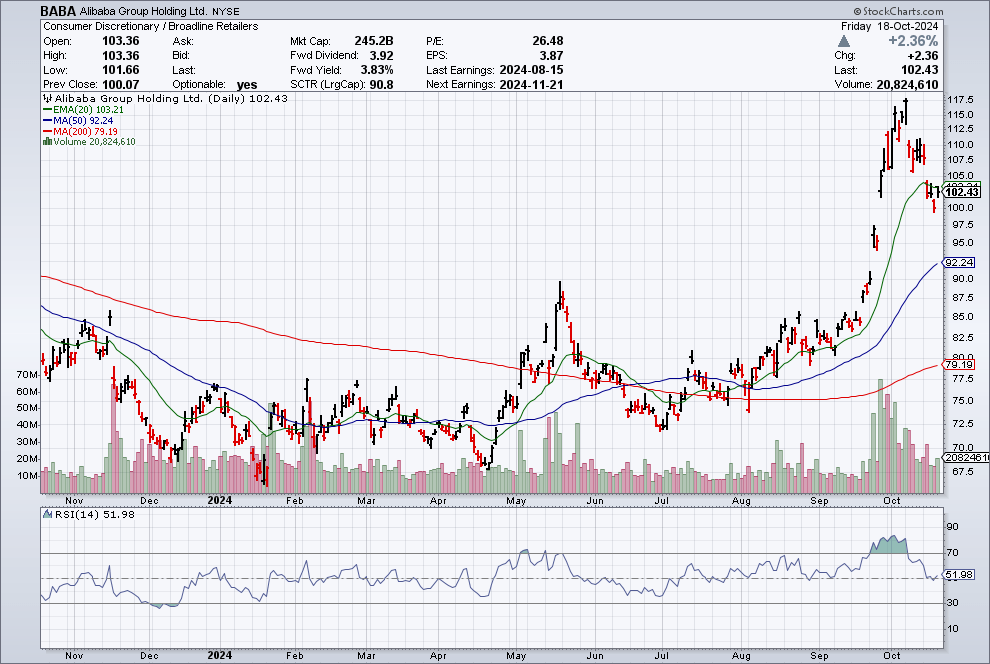 Alibaba Group Holding (NYSE:BABA) has enjoyed a parabolic rise in its stock price in September and October, after Beijing announced stimulus measures that are meant to promote economic growth and help both companies and consumers deal with a slow-growing economy. The stimulus proposal primarily focuses on the financial sector; however, that is poised to lower refinancing rates.