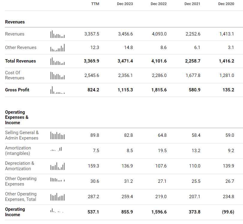 AMR’s insiders own over 11% of the company, and its market cap is currently $2.898B. I would advise you to scroll back up and look at the OI AMR generated in FY 22. It was $1.5B! Now I hear what you are saying, “that was a one-time outlier year with the bullwhip effect from Covid and the Russia invasion presenting a unique period for met markets.” I partially agree with you.